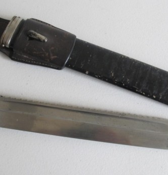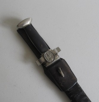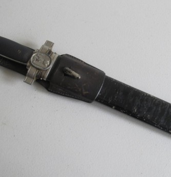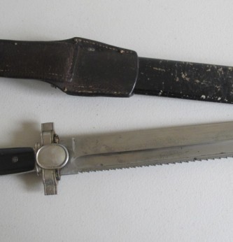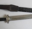 Third Reich Red Cross Mans Dagger. Complete with its black chequered grip. Nickel mounts with Red Cross Eagle and swastika. Excellent saw back blade with screw driver tip. Complete with correct pattern scabbard with about 80% of original black paint finish and all screws intact. Completed with its black leather frog. A good overall condition example of this Red Cross Mans dagger.