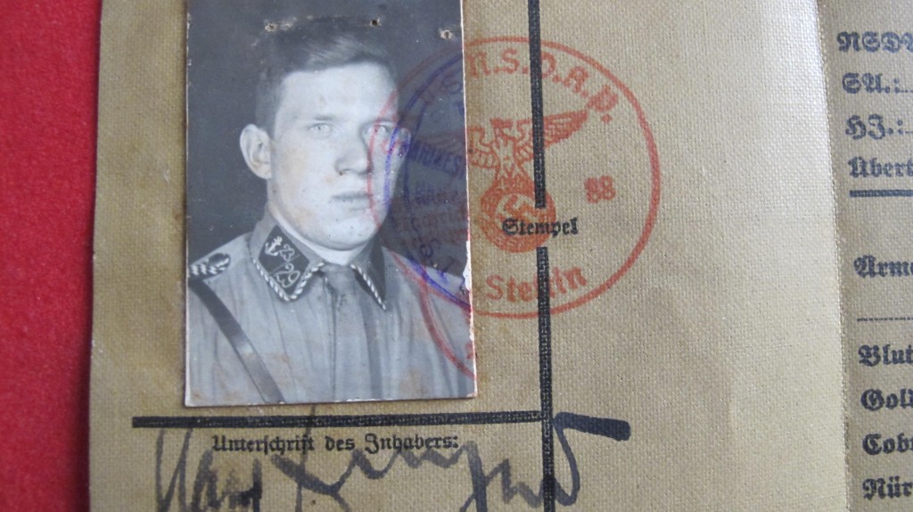 Scarce Third Reich linen Ausweiss SA Marine Identification Pass. Complete with good uniform photo showing wearing SA marine collar patch and his SA membership number and date of joining 12.4.1943. Good condition.