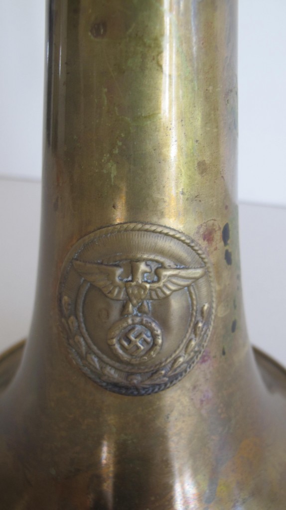 Unusual Third Reich SA Musicians trumpet. Brass construction. Complete with mouthpiece. Lower fluted section with raised early SA eagle with oak leaf wreath below. Good overall condition.