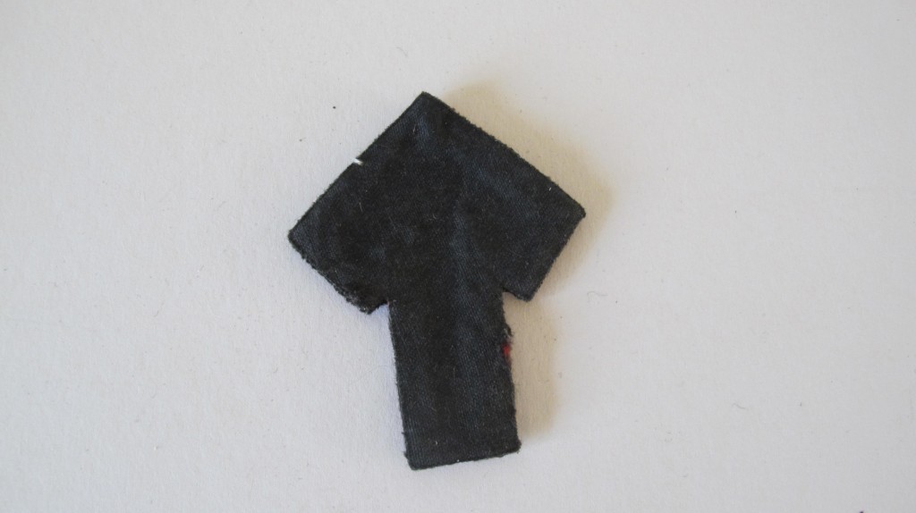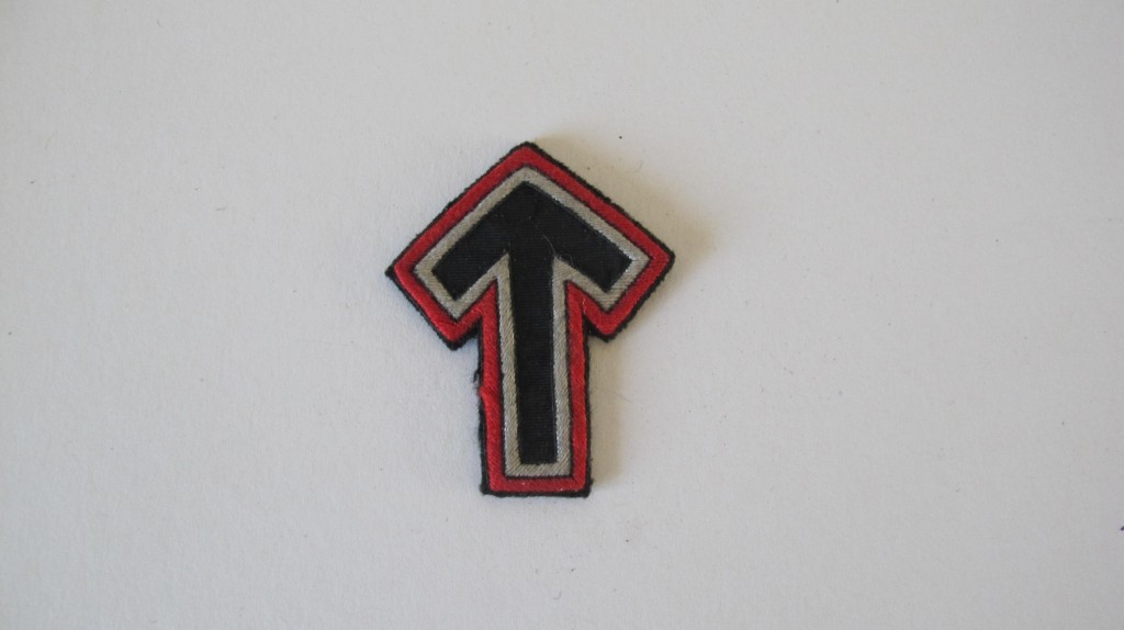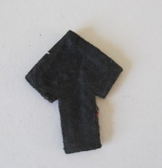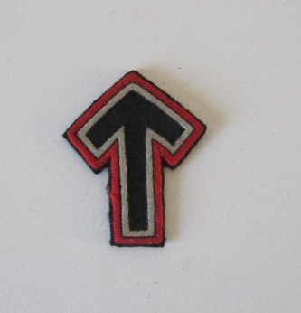Third Reich cloth Tyr-Rune. As worn by officer personnel of the SA/SS Officer Graduates. Worn by members who had successfully passed through the State Leadership School at Munich.. Black/red/white cloth. This insignia was worn above the swastika arm band. Good condition example.