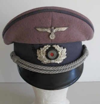 Scarce Third Reich Army Officers peaked cap for a Sonderfuhrer. Blue/grey lower band with blue/grey piping. Comes complete with its period attachment metal insignia. Officers cap cords. Manufacturers sweat label to inside of cap with Kassel maker. Nice tall saddle shaped cap. Unfortunately some scattered moth damage to crown and band of cap. However, a rare and hard to find cap.