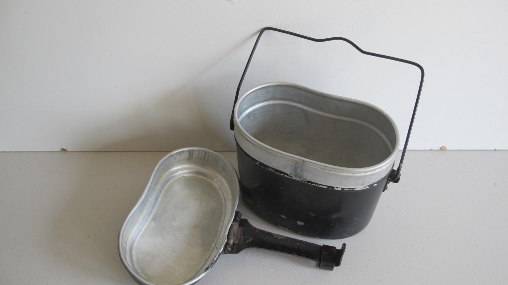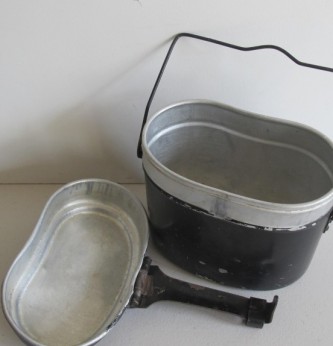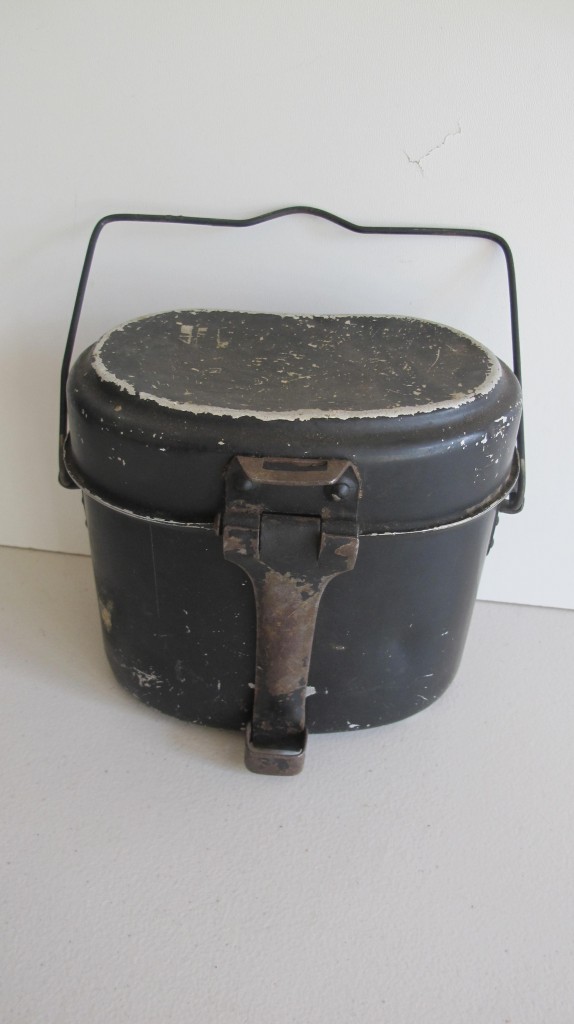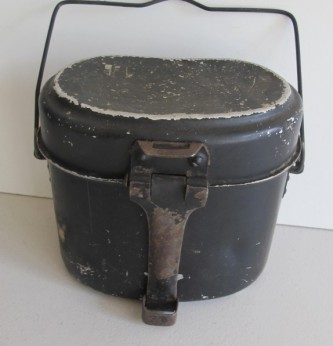 Third Reich SS Issue Mess tin. Retains 90% of its black paint finish. Complete with handle and carrying handle. Good overall condition.