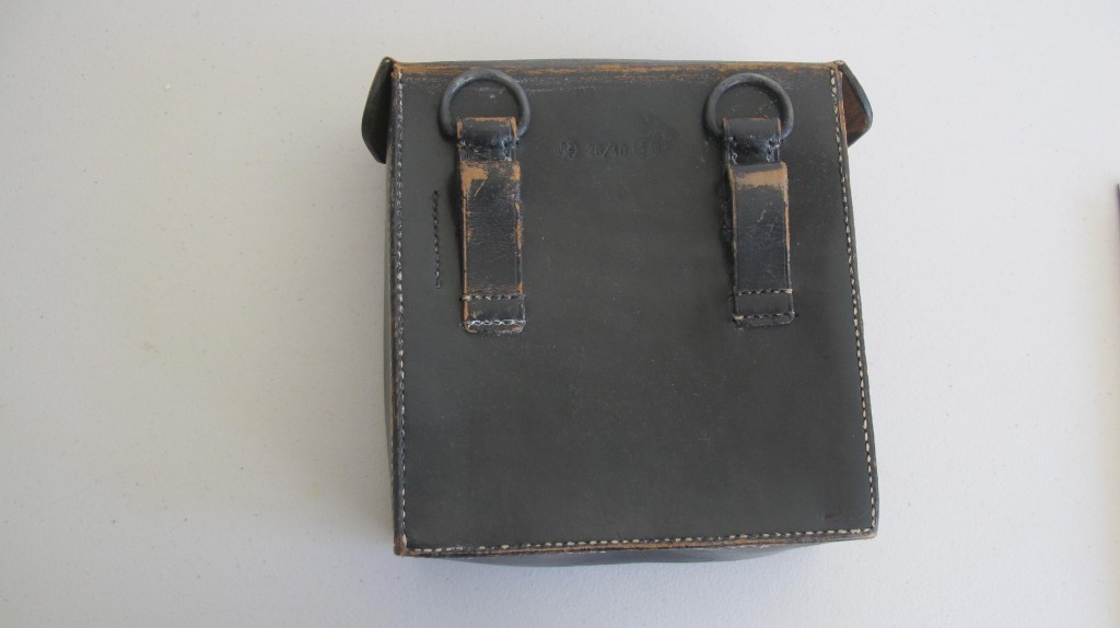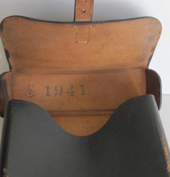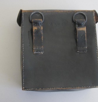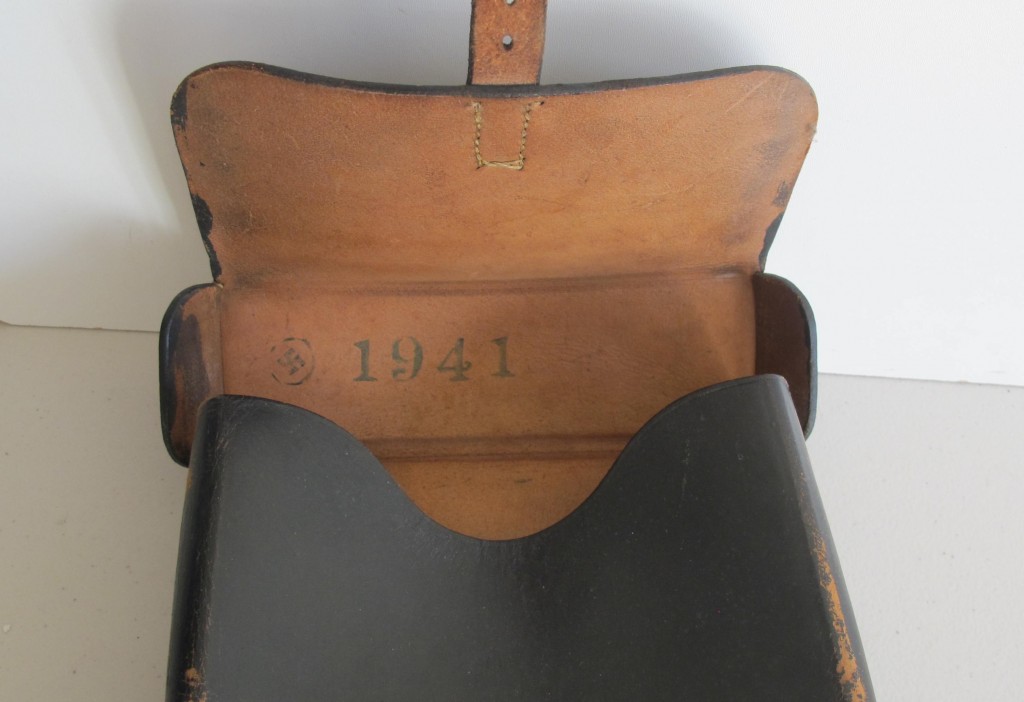 Black leather Waffen SS Officers Equipment pouch. Complete with belt loops to rear and attachment D rings for strap. RZM SS marked to rear and underneath marked 1941. Leather in overall good condition.