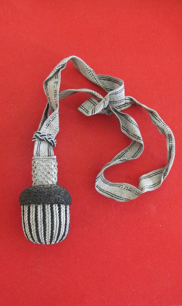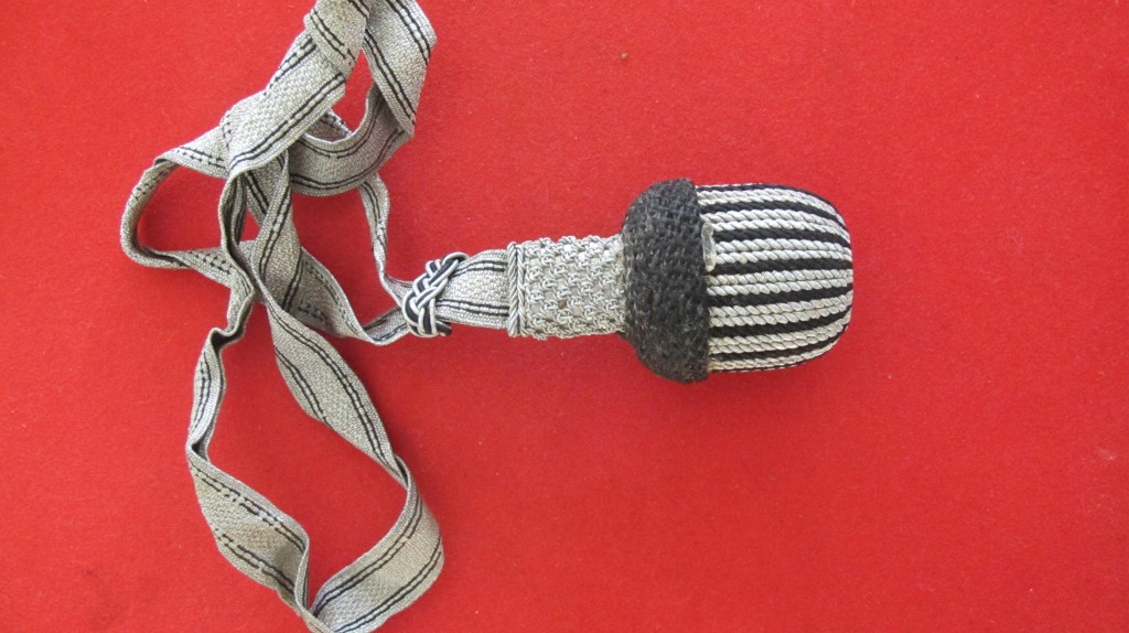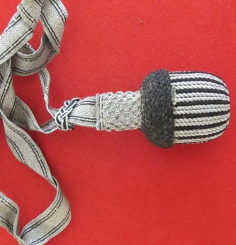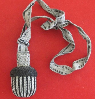 Third Reich SS Officers Prince Eugen Pattern sword knot. Silver wire with black flecking and black and silver acorn knot to end. Good used example taken from sword. Scarce and seldom found.