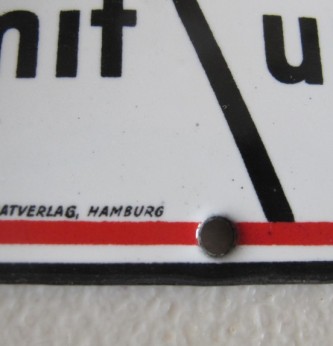 Rare Third Reich Supporters door plaque. Shows party flag and marked Mit Uns (with us). Manufactured by Deutscher Plakatverlag Hamburg. Small chip to lower part of enamel otherwise perfect. Measures 8 x 12 cm. Displayed on doors of supporters during the Third Reich period and during the vote to bring Hitler to power.