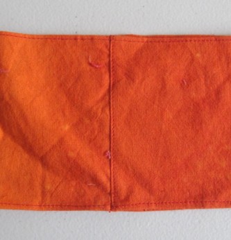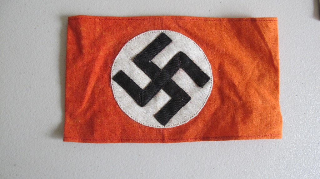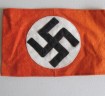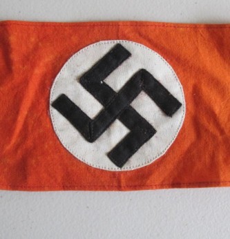 Third Reich red cotton swastika arm band. Three piece construction. Good condition. As worn by SA and Party members at rallies etc.