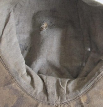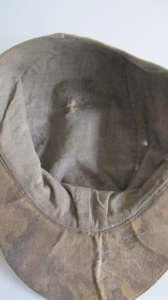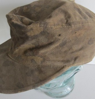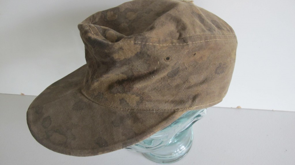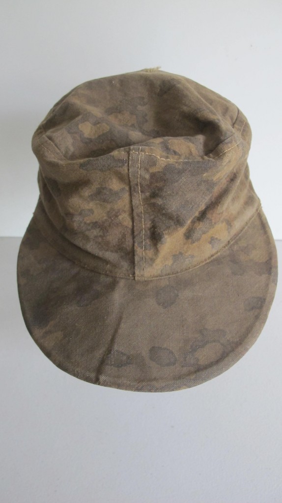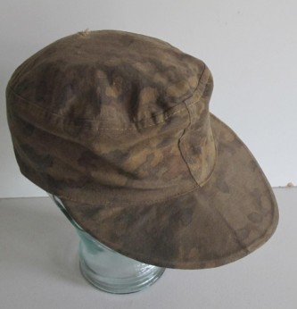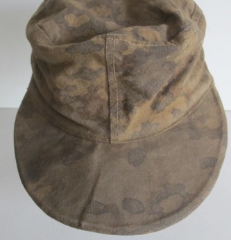 Third Reich Waffen SS Autumn camouflage M43 cap. Subdued autumn ammo with double stitched air vents to side. Mouse grey cloth lining. 1944 date to inside and remains of another stamping but unreadable now. One small hole to top of cap from battle service wear, otherwise overall good. An interesting example of this late war cap.