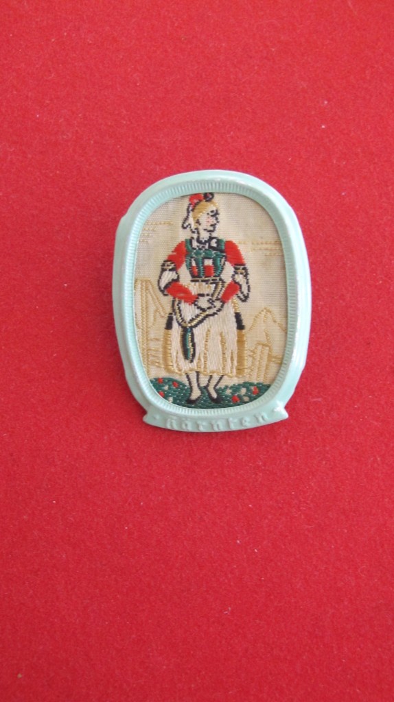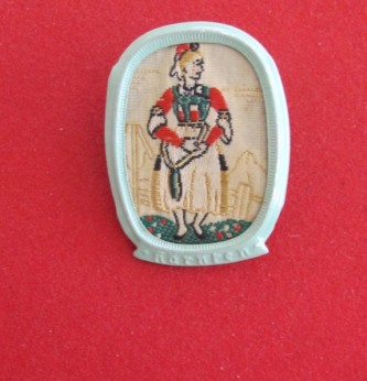 Third Reich Winter Help rally badge. Woven with German woman in National costume. Pin back fixing. Good condition.