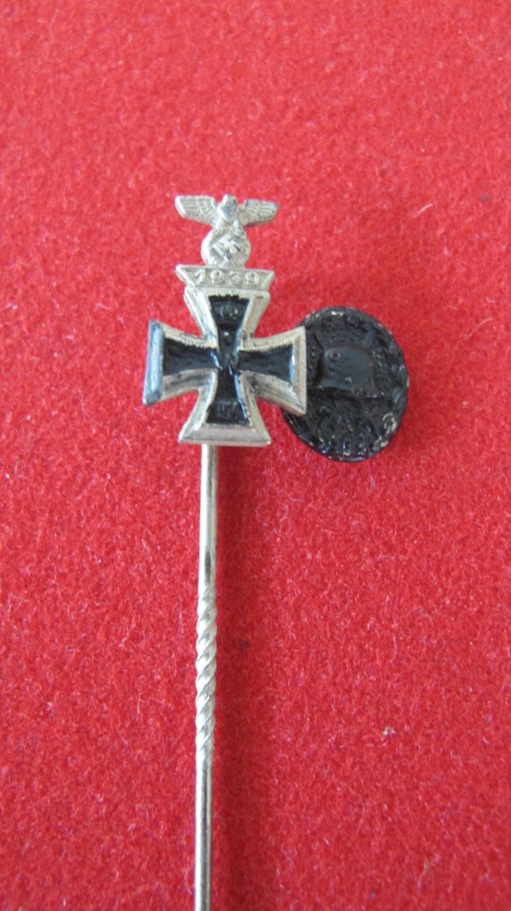 Interesting Third Reich stick pin showing award of Imperial Iron Cross, black wound badge and Bar to Iron Cross. As worn on civilian clothing to show entitlement to awards. Complete with long pin fixing and retaining all its original finish.