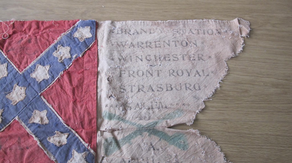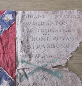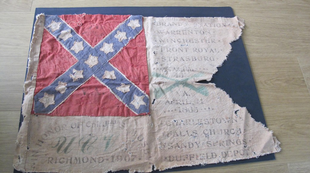 Scarce single sided historically important Confederate veterans flag commemorating Col S Mosby, Richmond 1907, 43rd VA Mosbys Command Cavalry Battalion Partisan Rangers. To side of flag has battle honours Brandy Station, Warrington, Winchester, Front Royal, Strasburg, Charlestown, Falls Church, Sandy Springs and Duffield Depot. Marked 43rd VA. Good sound condition for age. A unique Veterans banner.