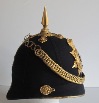 Excellent condition for age Victorian Officers Home Service Helmet of the Gloucestershire Regiment. Perfect blue cloth helmet with gilt spike and chin chain. Victorian crown helmet plate to front. Excellent silk and leather lining. Overall an excellent example of this scarce Home Service Helmet.