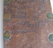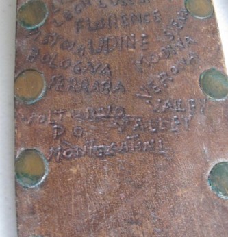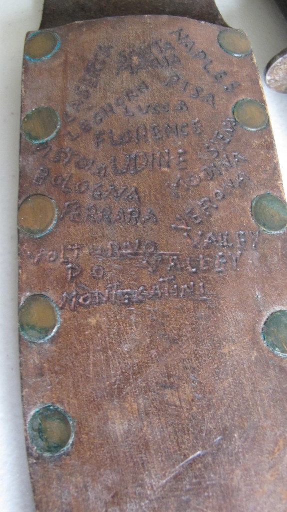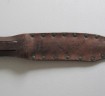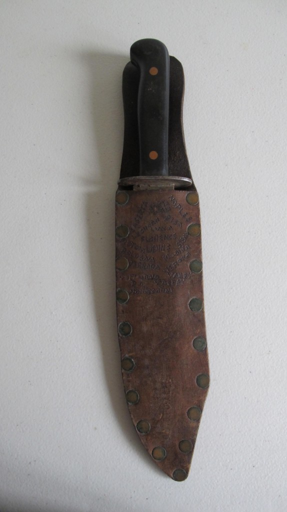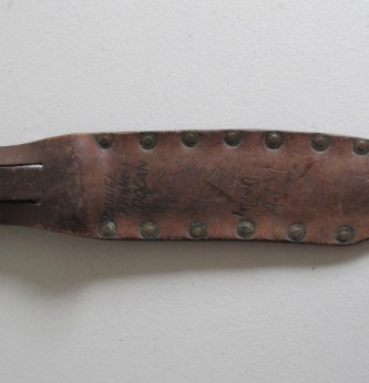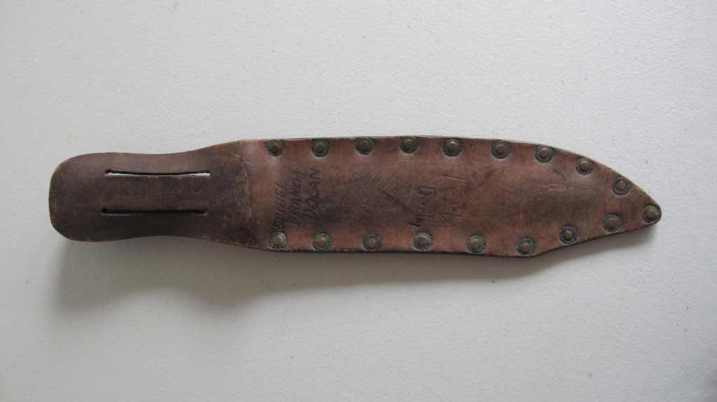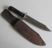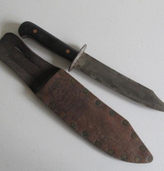 Black bakelite grip US Marine corps/ranger bowie bladed fighting knife. Compete with steel cross guard. Comes complete with its original leather scabbard with belt loop, Scabbard decorated with the areas that this commando served. Reverse of scabbard carved with his name and 401st. A nice been there fighting knife that has seen action.